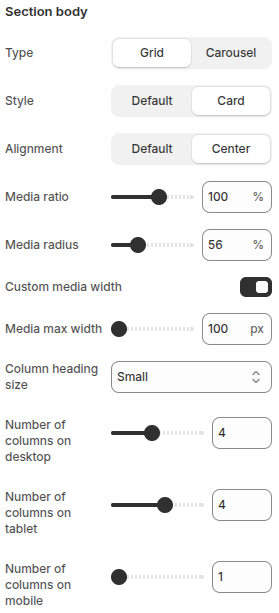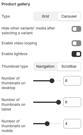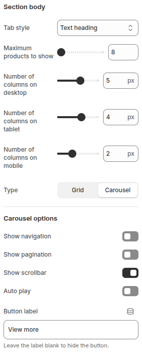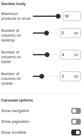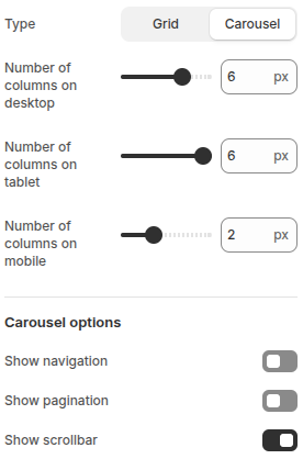 Carousel: Products are shown in a horizontal slider (carousel) that can scroll through items, with optional navigation, pagination, and scrollbar controls. - Number of columns on desktop: Choose how many products per row on desktop.