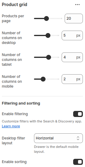 - Enable filtering: Allows customers to filter products using filters set up with the Search & Discovery app.