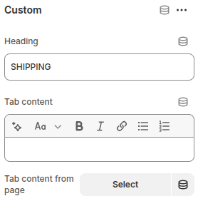 The Product Tab section is designed specifically for the Main area of the product detail page. It allows you to organize and display detailed product information or additional content in a tabbed layout, making it easier for customers to navigate between different types of information such as product descriptions, specifications, shipping details, or other custom content.