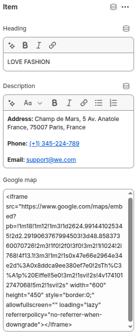 - Google Map iframe: Enter the embed code (iframe) provided by Google Maps to display your selected location on the website.